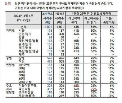 한국갤럽에서 진행한 설문에서 국민의 과반이 1인당 25만 원씩 지원하자고 논의되고 있는 ‘민생회복지원금’을 반대한다는 결과를 내놓았다. 전 국민에게 25만 원씩 지급하되 기초생활수급자와 취약계층에는 10만 원씩 추가로 지급하는 방안이 예상된다. 전체 소요되는 예산은 약 13조 원일 것으로 예상된다. 여러 언론에서 25만 원 지급에 대한 갑론을박을 보도하고 있다. 22대 국회가 개원하면서 이에 대한 논의가 본격적으로 진행될 것이라고 예상해 본다.